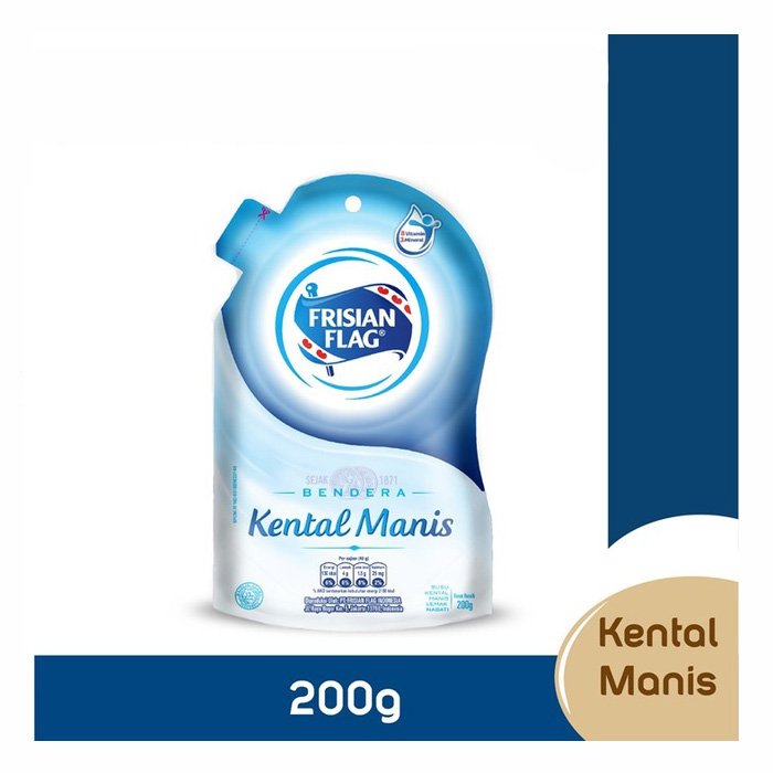 Frisian Flag Susu Bendera Kental Manis Pouch 200gr x 24 merupakan susus kental manis yang mengandung zat gizi makro (protein, karbohidrat dan lemak) serta mengandung 8 Vitamin (Vitamin A, D3, E, B1, B2, B3, B6 dan B12) dan mineral. Susu ini dapat dikonsumsi sebagai pelengkap sajian dikombinasikan dengan bahan makanan lain (seperti buah-buahan segar) menjadi minuman sehat atau menambah kelezatan cita rasa makanan dan minuman.