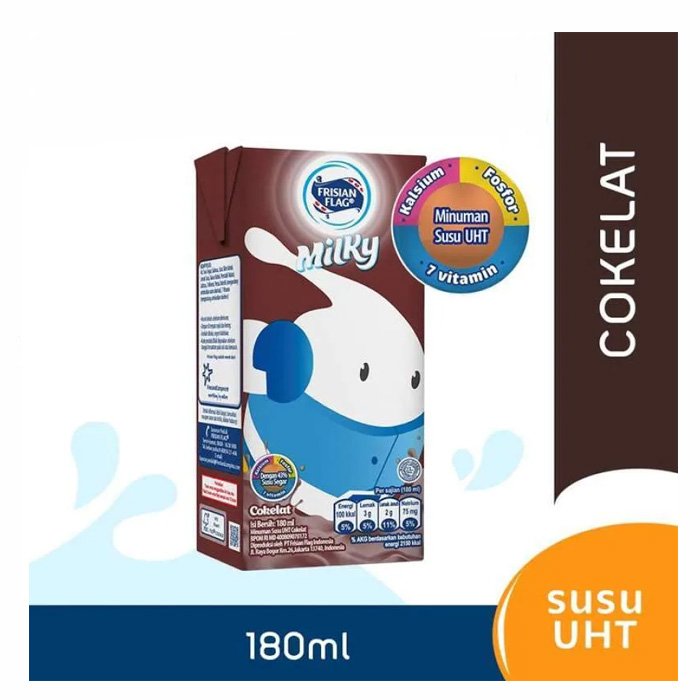Susu Siap Minum Frisian Flag Milky UHT Kotak diproduksi dengan susu segar dengan kandungan zat gizi makro (protein, karbohidrat dan lemak) dan 7 Vitamin: Vitamin A, B1, B2, B3, B6, B12 dan D3 serta Mineral: Kalsium dan Fosfor dan untuk mendukung aktivitas harian si Kecil dengan rasa yang enak.