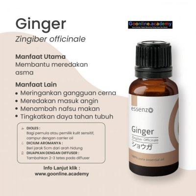 Ginger oil berasal dari bagian Rhizoma (rimpang) segar dari tanaman jahe – yaitu tangkai bagian bawah yang biasanya menyembul keluar dari akar. Ginger yang seringkali ditemukan dalam masakan-masakan Asia memiliki citarasa pedas, hangat, dan harum ketika digunakan sebagai bumbu masak. Apabila dikonsumsi secara internal, Ginger dapat membantu kesehatan pencernaan dan menghilangkan mual-mual.* Minyak esensial Ginger juga dapat digunakan secara topikal atau dihirup untuk mendapatkan efek menenangkan.