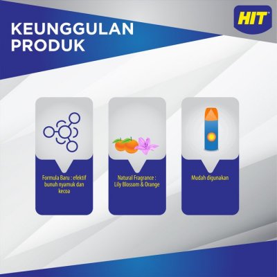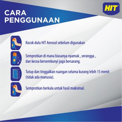 Merupakan cairan ampuh membasmi nyamuk dan serangga yang praktis berbentuk aerosol. HIT Aerosol ini memiliki formula baru yang jauh lebih efektif secara cepat mengusir nyamuk dan serangga di ruangan Anda, serta dengan aroma yang natural dan nyaman.