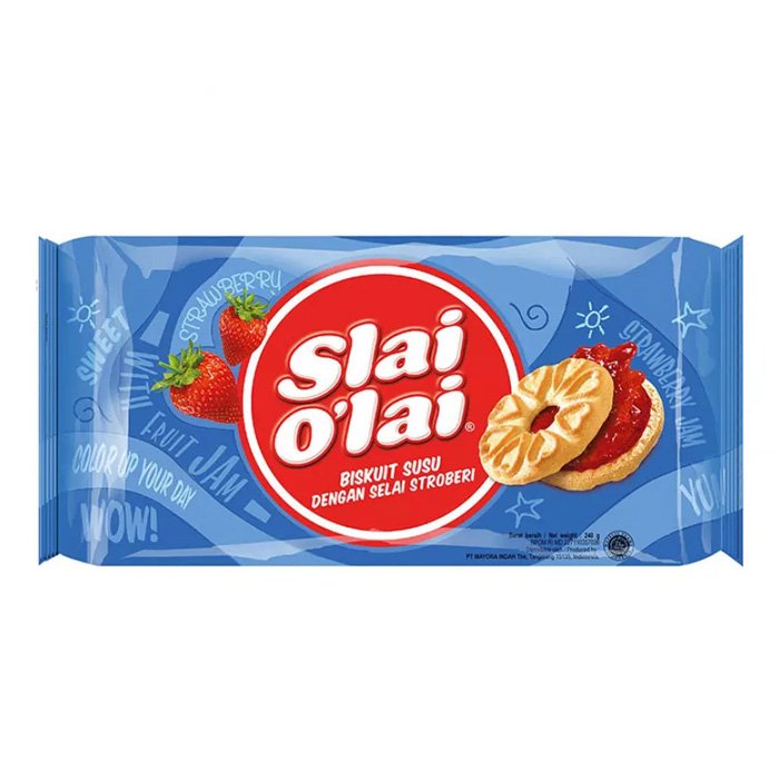 Saat bersantai memang tepat untuk nyemil, paling enak biasanya di temani teh atau kopi lalu dengan biskuit. Sejak 1977 Slai O’lai sudah berada di hati masyarakat karena selalu menghadirkan biskuit renyah dan sehat sebagai teman yang pas untuk menemani meminum teh. Slai O’lai dihadirkan oleh Mayora sebagai varian biskuit rasa buah dalam bentuk sandwich. Slai O’Lai Strawberry merupakan salah satu varian biscuit sandwich yang memberikan selai strawberry asli di tengah biskuitnya. Biskuit susu ini begitu lembut dan gurih karena kaya dengan kandungan susu yang disempurnakan. Biskuit sehat sebagai sumber kalsium ini diperkaya dengan kandungan vitamin B1, B2, B6, B12, dan vitamin E yang begitu baik untuk tubuh. Kelezatan rasa biskuit yang sehat ini tidak pernah diragukan lagi. Hadirkan selalu Slai O’Lai Strawberry di saat santai atau di tengah kesibukan Anda. Menggigit Slai O’Lai Strawberry ditemani teh atau kopi dengan aroma yang wangi akan menambah kenikmatanya.