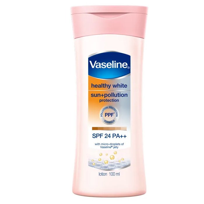 Bandung - Vaseline Healthy White Sun + Pollution Protection SPF24 200ml, terkandung Pollutan Protection SPF 24 & PA++ Wanita selalu menggunakan hand body atau body lotion untuk merawat dan melindungi kulitnya dari berbagai masalah kulit, seperti warna kulit tidak merata. Oleh karena itu diperlukan body lotion yang tidak hanya melindungi kulit tetapi juga mampu melembabkan sekaligus menjaga kulit dari sinar matahari, misalnya Vaseline Healthy White Sun + Pollution Protection SPF24. Hadir dengan dibekali kandungan SPF24 dan PA++ menjadikan produk lotion ini mampu memberikan perlindungan kulit dari sinar UVA atau UVB yang bisa menyebabkan penuaan dini dan penggelapan warna kulit. Adanya kandungan PPF / Pollution Protection Formula pada hand body Vaseline juga berguna untuk membantu melindungi kulit dari bahaya polusi. Tak hanya itu, Vaseline Healthy White Sun + Pollution Protection SPF24 juga hadir dengan diperkaya Vitamin B3 alami yang dapat membantu menjaga kulit agar tetap cerah dengan cara menghambat produksi melanin.