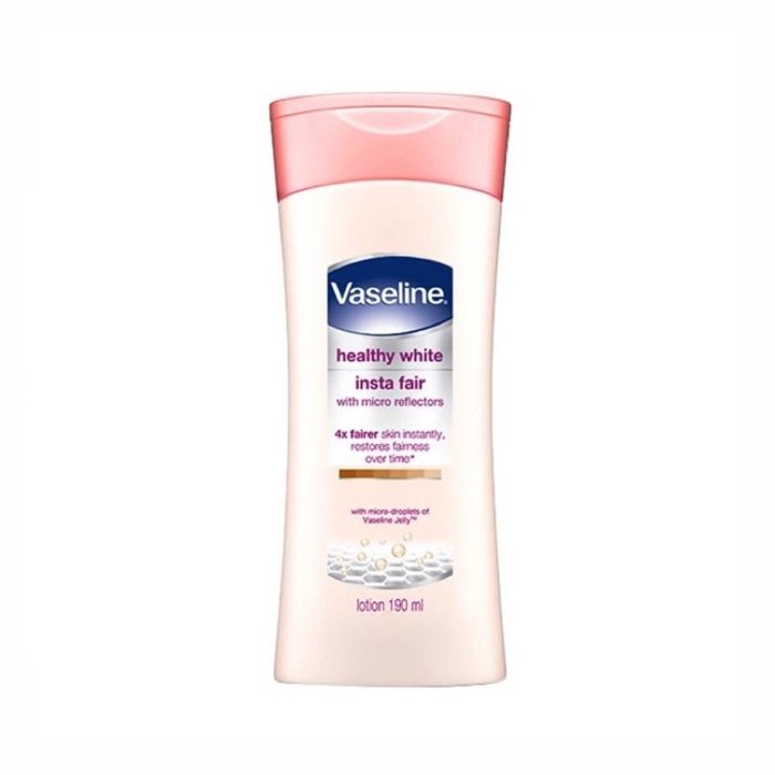 Terpapar sinar UV, polutan, dan hal berbahaya lain setiap hari dapat memicu produksi melanin, sehingga membuat kulitmu tampak lebih gelap dan rusak. Vaseline Healthy White Insta Fair mengandung micro-reflectors agar kulit 4x lebih cerah seketika* serta bahan-bahan aman, seperti Vitamin B3 alami yang membantu mengembalikan kecerahan kulit. Triple sunscreens menghalangi sinar UVA dan UVB untuk melindungi kecerahan kulit dari kerusakan lebih lanjut. Hasilnya adalah lotion yang memberikan kelembaban guna membantu memperbaiki kulit yang rusak dan gelap, membuatnya lebih sehat dan lebih cerah seketika.